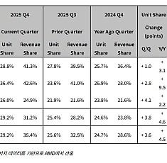 시장 조사 기관 머큐리 리서치(Mercury Research)가 발표한 2025년 4분기 보고서에 따르면, AMD는 클라우드 및 엔터프라이즈 전반에서 에픽(EPYC) 프로세서 채택의 가속화에 힘입어, '서버 부문 매출 점유율(Revenue Share)'에서 역대 최대치인 41.3%를 달성했다.또한 라이젠(Ryzen) 수요 증가로 인해 데스크톱 매출 점유율 …