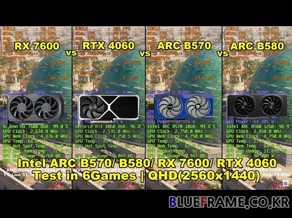 AMD, CPU, 벤치마크, BenchMark, 게임 벤치, Game Bench, MS, Windows 11, Win 11, Windows 11 Pro, Win 11 Pro, 24H2, Intel, Ryzen 5, 라이젠 5, 9600X, 인텔, 아크, ARC, QHD, 2560x1440, GDDR6, NVIDIA, B580, B580 12GB, 12GB, 8GB, RTX 4060 Ti, RTX 4060, GeForce RTX 4060, Radeon RX 7600, RX 7600, B570, B570 10GB
