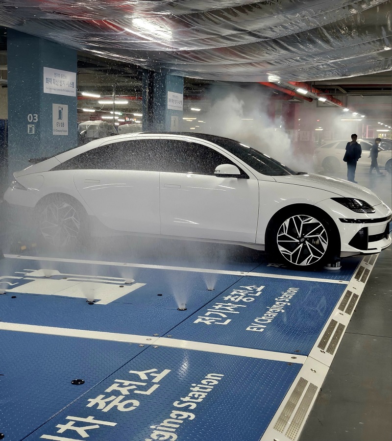 또한 지하 주차장에서 전기자동차 화재가 발생된 경우를 가정하여 소방용품 전문 제조업체인 육송에서 자체 개발한 AI 화재감지연동 “전기차 상방향직수자동화장치”를 미리 설치하여 연기 및 열감지를 통해 화재에 따른 시간대별 화재 진압 성과를 테스트했다. 전기차 상방향직수자동화장치은 AI 융복합 화재감지기가 작동하여 전기차 화재 발생시 1분 이내에 빠르게 감지하고 차량 하부에 집중 살수, 화재 확산 방지와 연기 확산 방지 등을 통해 인명피해와 재산피해를 최소화하는 자동화시스템이다.