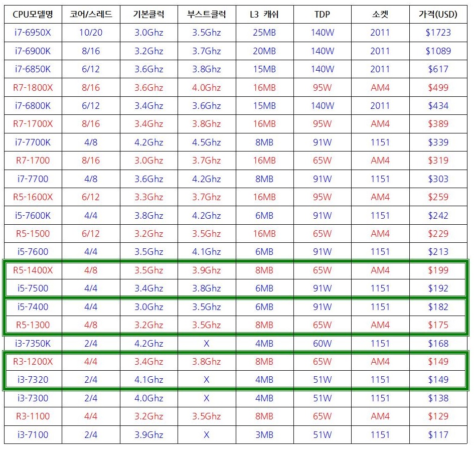 CPU/MB/RAM | 인텔과 AMD RYZEN cpu 스펙과 가격 비교