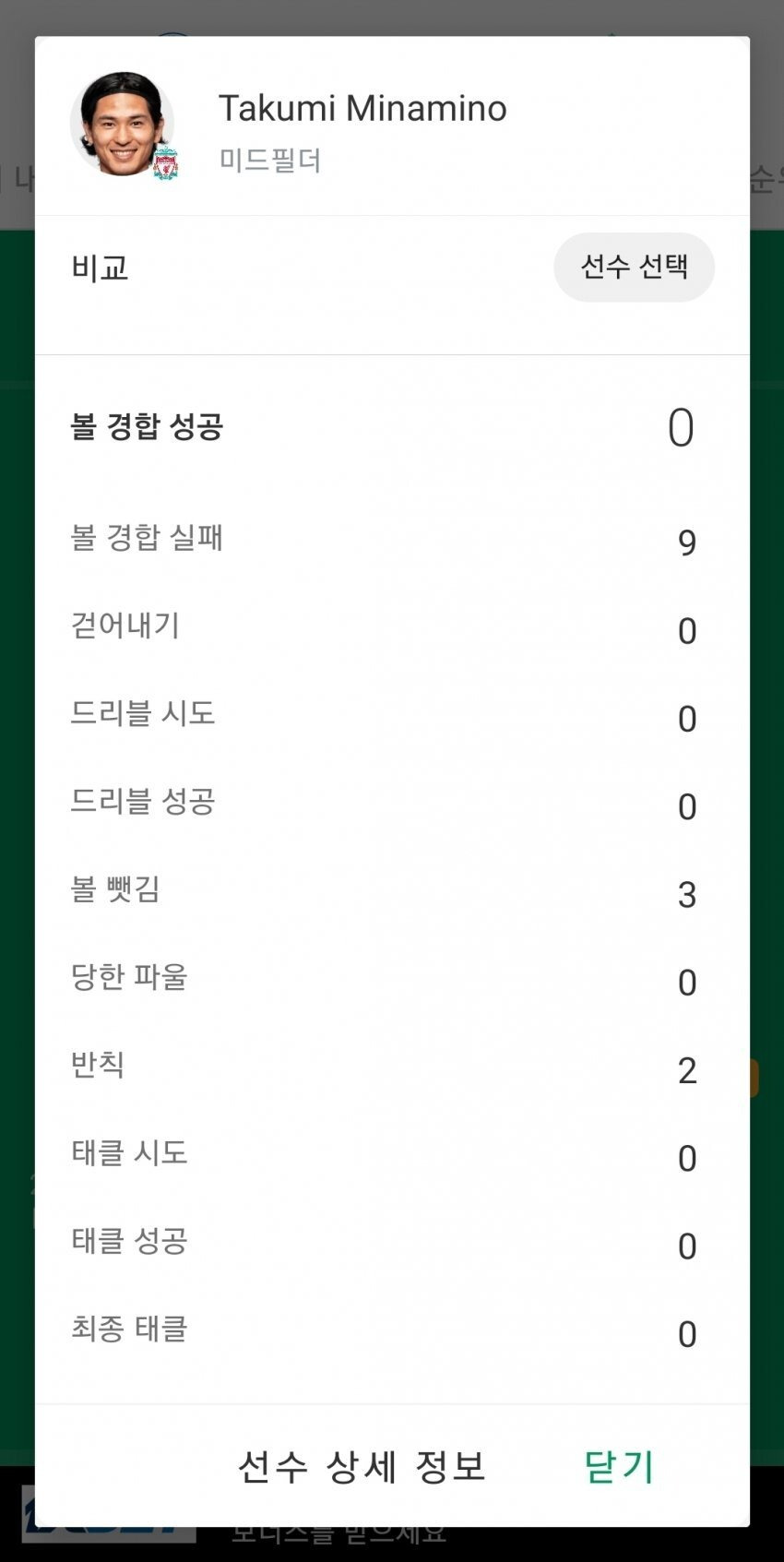 오늘 중앙 미드필더로 나온 미나미노 스탯 요약