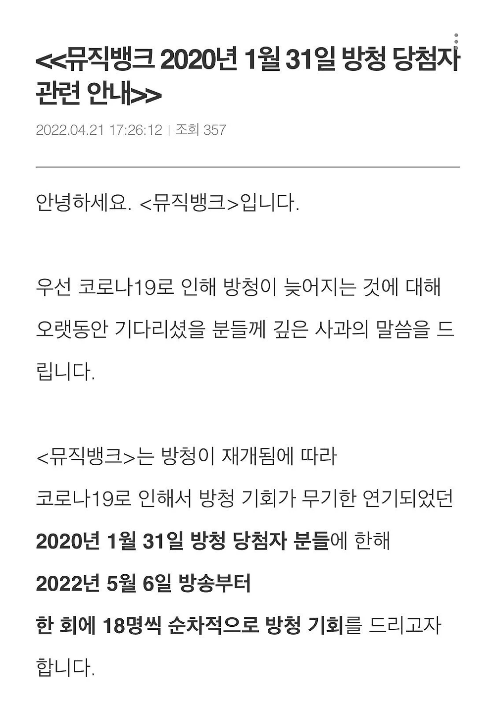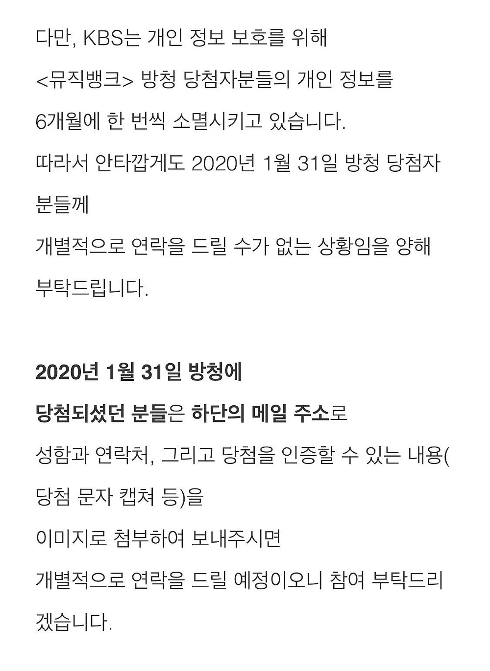 뮤직뱅크 2년 전 방청 당첨자를 찾는다고 합니다.