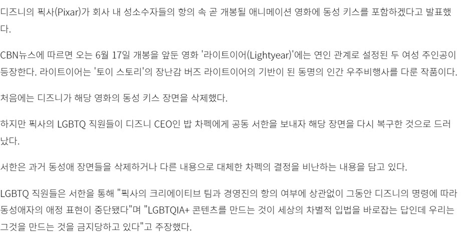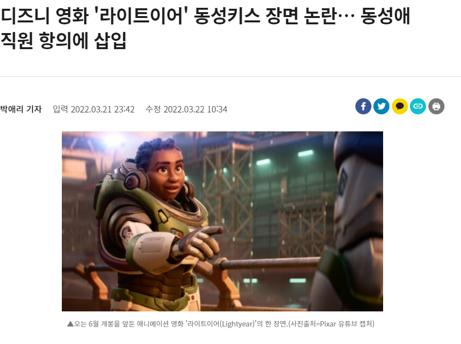 디즈니 영화 버즈 라이트 이어 동성애자 키스 장면 추가