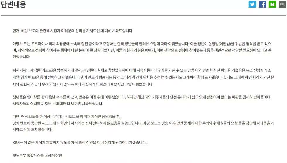 시청자들은 KBS 시청자 청원 게시판에 책임자 처벌 + 진실된 사과를 요구하는 청원을 올렸지만, 의용군은 범법자라는 논점에서 벗어난 내용에