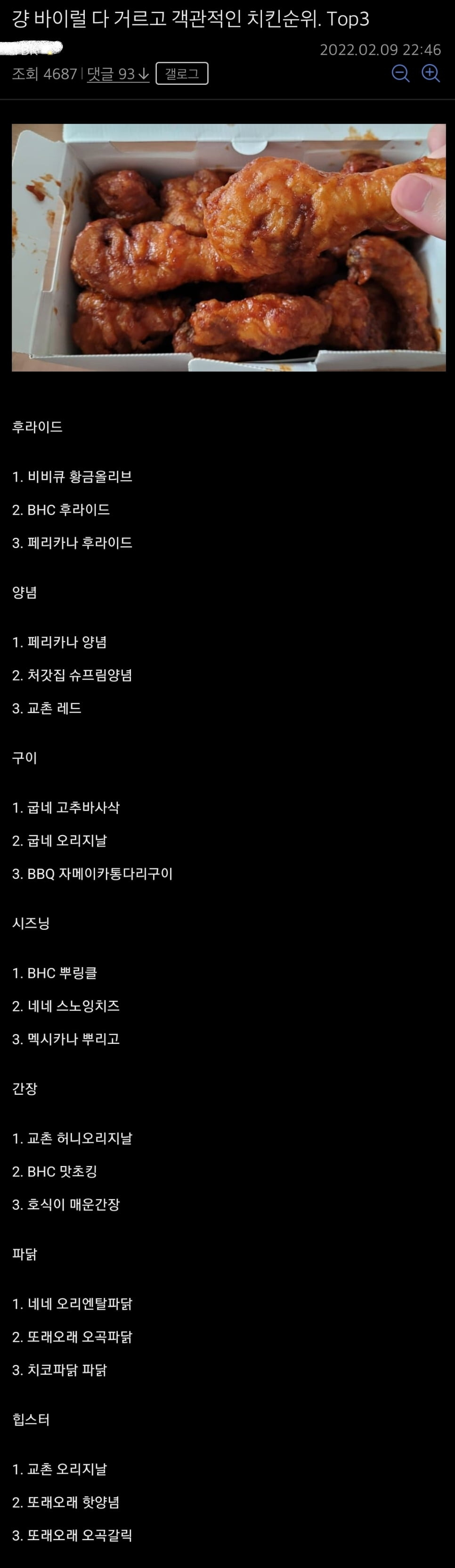 치킨갤러리 선정 부문별 top3 치킨