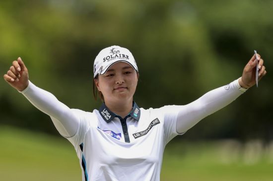 고진영이 2022시즌 첫 무대로 삼은 HSBC위민스월드챔피언십에서 우승한 뒤 환호하고 있다.