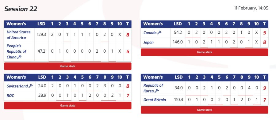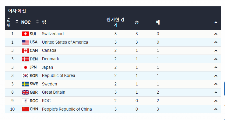 올림픽 여자컬링 2일차 결과 및 순위