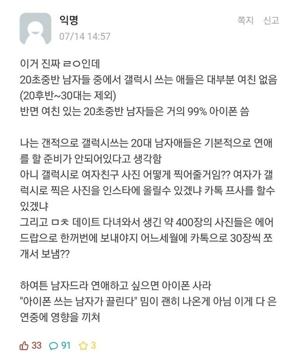 갤럭시 쓰면 연애 하면 안된다는 에타인