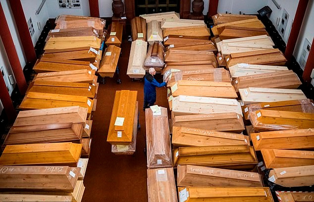 독일 작센주 마이센에 있는 한 화장터 대기실에 수많은 관이 겹겹이 쌓여있다. 이중 절반 이상은 코로나19로 사망한 사람의 시신을 담은 관이다. 사진=AFP 연합뉴스