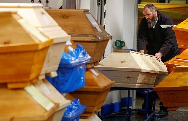 독일 작센주 마이센에 있는 한 화장터 대기실로 관을 옮기는 직원. 쌓여있는 것 중 절반 이상은 코로나19로 사망한 사람의 시신을 담은 관이다. 사진=로이터 연합뉴스