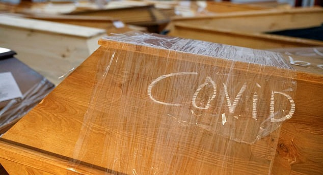 독일 작센주 마이센에 있는 한 화장터 대기실에 쌓인 관 중 하나. 코로나19로 사망한 사람의 시신을 담은 관에는 이처럼 ‘COVID’라는 글자가 쓰여 있다. 사진=로이터 연합뉴스