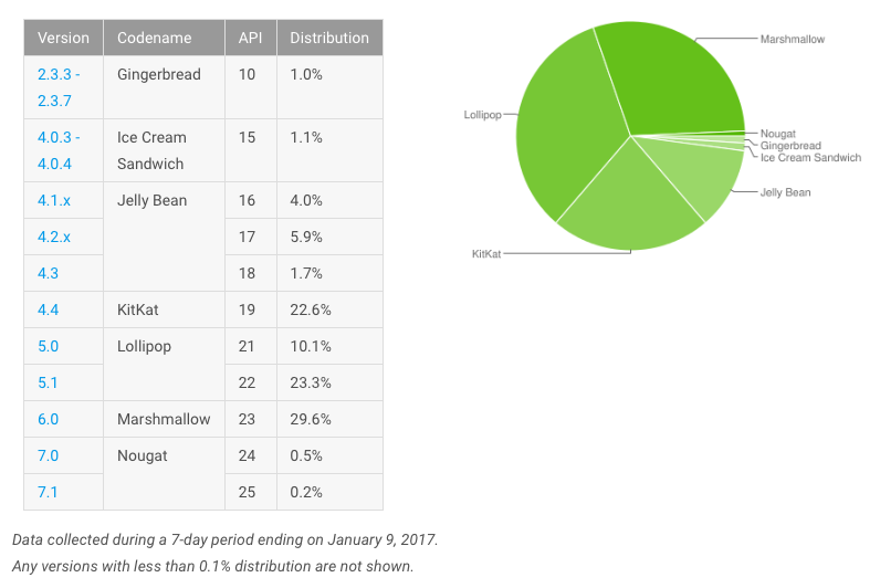 구글 (Google)이 2017년 1월 9일자로 안드로이드 운영체제별 점유율을 공개했다.