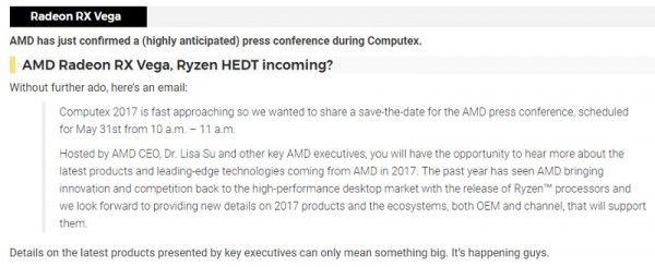 videocardz는 AMD가 보낸 이메일 (email)로 보이는 일부 내용을 공개하며 AMD는 컴퓨텍스 2017 기간 중인 5월 31일 오전 10에서 오전 11시 (현지시간) 사이 컨퍼런스를 열고 새로운 제품과 기술을 소개할 것이라고 전했다.