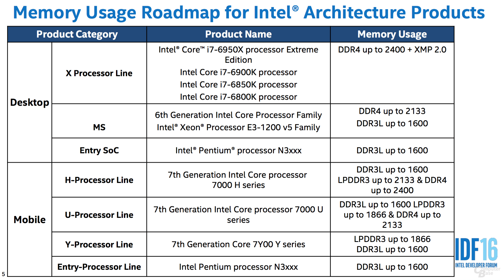 메모리 기술 관련 로드맵에서는 데스크탑 브로드웰-E 프로세서는 DDR4-2400과 XMP 2.0을 지원하고 메인스트림 스카이레이크는 DDR4-2133, DDR3L-1600을 지원한다.