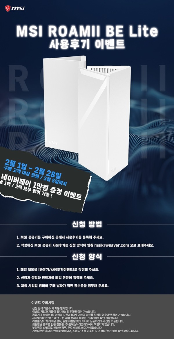 이번 이벤트는 2026년 2월 1일부터 2월 28일까지 MSI Roamii BE Lite를 구매한 고객이면 누구나 참여 가능하며, 사용 후기를 작성한 선착순 고객에게 네이버페이 1만 원을 증정한다. 이벤트 신청은 2026년 3월 5일까지 접수 가능하다.