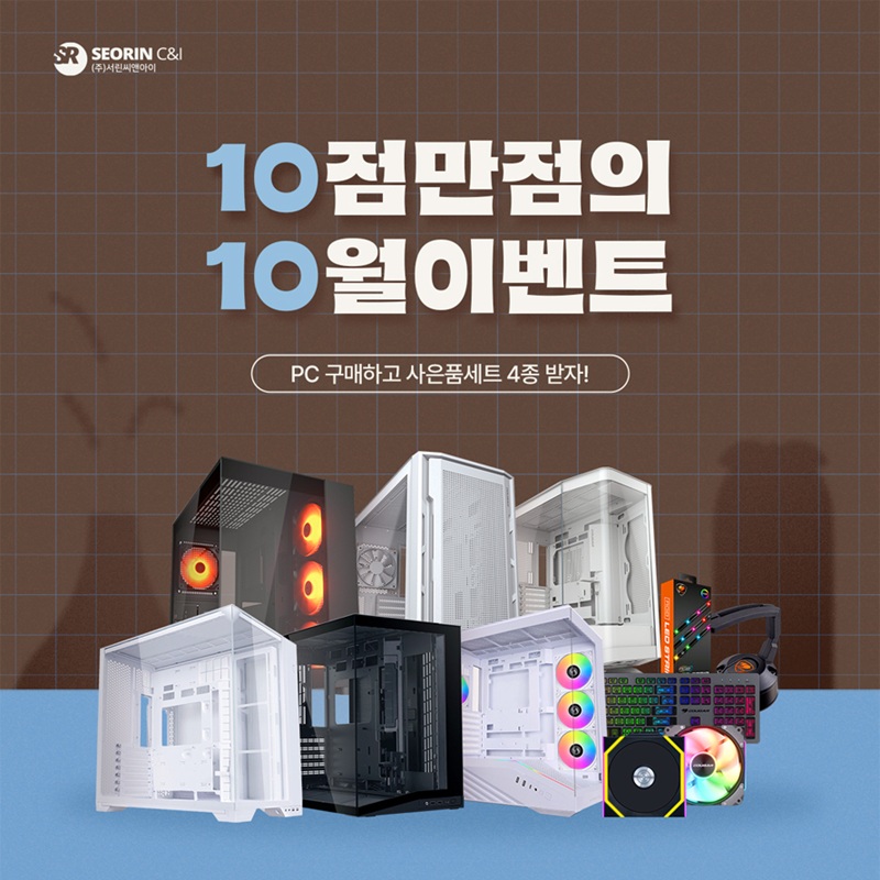 컴퓨터 관련 주요 부품 수입 유통 전문 업체 서린씨앤아이(대표: 전덕규 www.seorincni.co.kr)가 자사 유통 부품을 포함한 조립 PC 구매 고객을 대상으로 사은품 세트를 증정하는 10점 만점의 10월 이벤트를 진행한다.