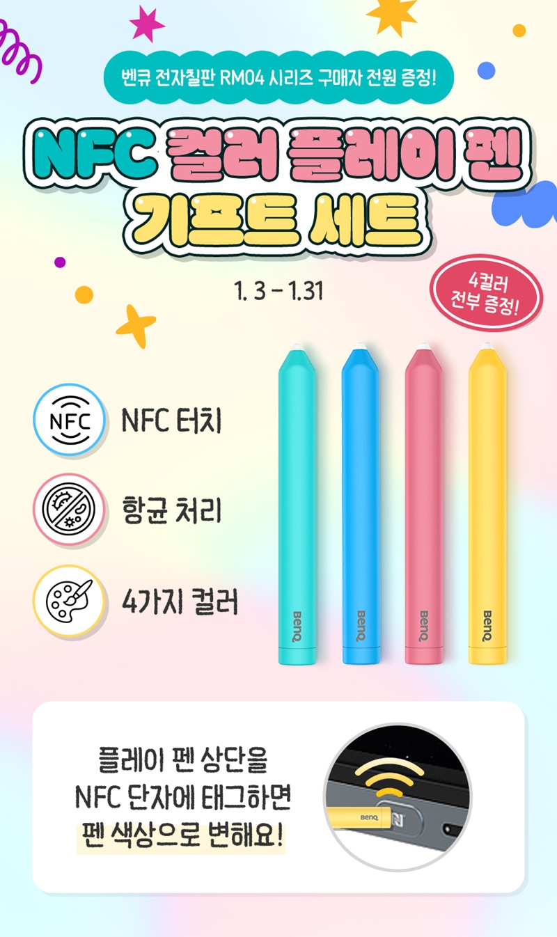 글로벌 디스플레이 전문 브랜드 벤큐(지사장 소윤석, www.benq.co.kr)가 인공지능(AI) 기술을 통해 수업의 효율성을 획기적으로 높인 최신형 전자칠판 RM04 시리즈를 대상으로 특별 프로모션을 진행한다. 이번 행사는 1월 3일부터 1월 31일까지 한 달간 진행되며, 벤큐의 마스터 시리즈 전자칠판인 RM04 모델을 구매하는 모든 고객에게 스마트한 수업을 돕는 ‘NFC 컬러 플레이 펜’ 4종 기프트 세트를 증정한다.