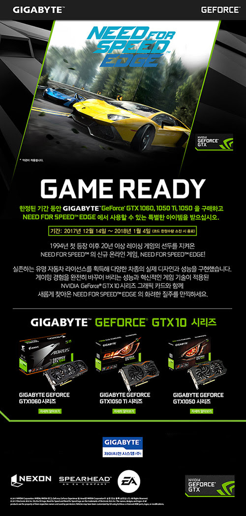 GIGABYTE Technology Co., LTD (이하 기가바이트)의 공식 공급원인 제이씨현시스템㈜ (대표: 차현배)에서는 2017년 12월 14일(목) 부터 내년 1월 4일(목) 까지 엔비디아와 함께 GIGABYTE 그래픽카드 구매자에게 니드포스피드 엣지 게임아이템을 증정하는 행사를 진행한다.