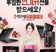 ㈜엠에스아이코리아(http://kr.msi.com , 대표 공번서)는 추석 황금연휴를 맞아 MSI 게이밍 노트북을 구매하는고객에게 푸짐한 사은품을 증정하는 한가위 특별기획전을 진행한다고 밝혔다. 이 행사는 9월 18일부터 행사제품을 구매하는 고객들에게 적용되며, 사은품 소진 시 자동 종료된다.이번 기획전을 통해 인텔 7세대 코어 프로세서(카비레이크) 기반의…