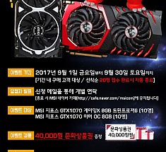 ㈜엠에스아이코리아(http://kr.msi.com, 대표 공번서)는 ‘MSI 지포스 GTX1070 게이밍X 8GB 트윈프로져6’와 ‘MSI 지포스 GTX1070 아머 OC 8GB’ 그래픽카드 제품에 대한 사용기를 작성한 고객 중 이벤트를 신청하는고객에게 선착순으로 ‘문화상품권 4만원’을 증정하는 행사를 진행한다고 밝혔다.이벤트 기간은 2017년 9월 1일 …