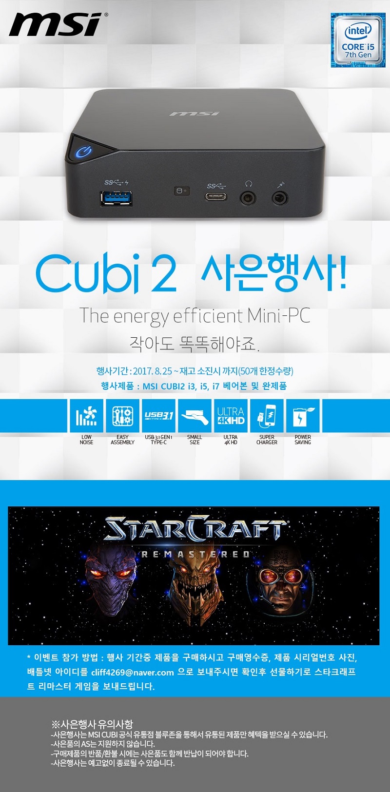 (주)엠에스아이코리아, 엠에스아이, MSI, MSI Korea, 미니PC, 큐비2, Cubi 2, 구매자, 인기 게임, 스타크래프트 리마스터, 증정, 이벤트, 진행,