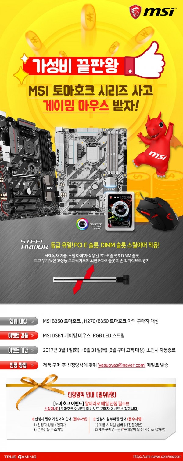 (주)엠에스아이코리아, 엠에스아이, MSI, MSI Korea, H270, B350, 토마호크, 토마호크 아틱, 제품 구매 고객, DSB1 게이밍 마우스, PHANTEKS RGB LED 스트립, 경품 증정, 이벤트, 진행,