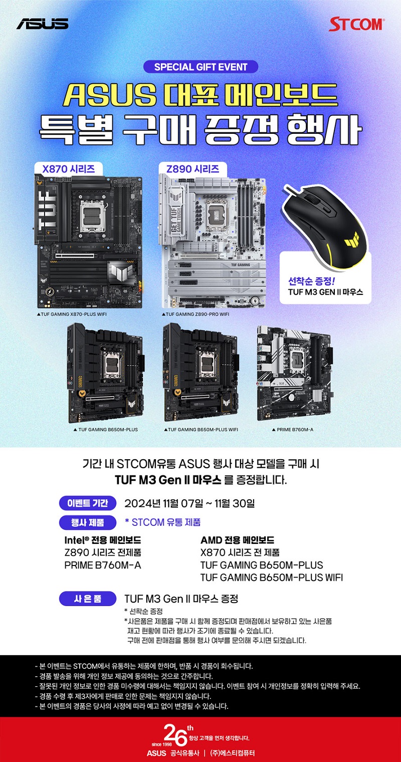 ASUS 대표 메인보드 구매 사은품 행사는 STCOM에서 유통하는 행사 대상 ASUS 메인보드를 대상으로 진행되며 2024년 11월 7일부터 11월 30일까지 구매자를 대상으로 TUF Gaming M3 Gen II 마우스를 증정한다.