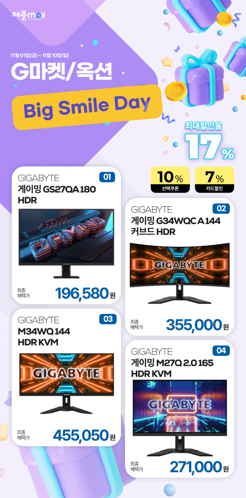 GIGABYTE Technology Co., LTD(이하 기가바이트)의 공식 공급원인 제이씨현시스템㈜(대표: 차중석, 차정헌)은 11월 1일부터 11월 10일까지 G마켓, 옥션 11월 빅스마일데이를 통해 기가바이트 모니터 할인 행사를 진행한다고 밝혔다.