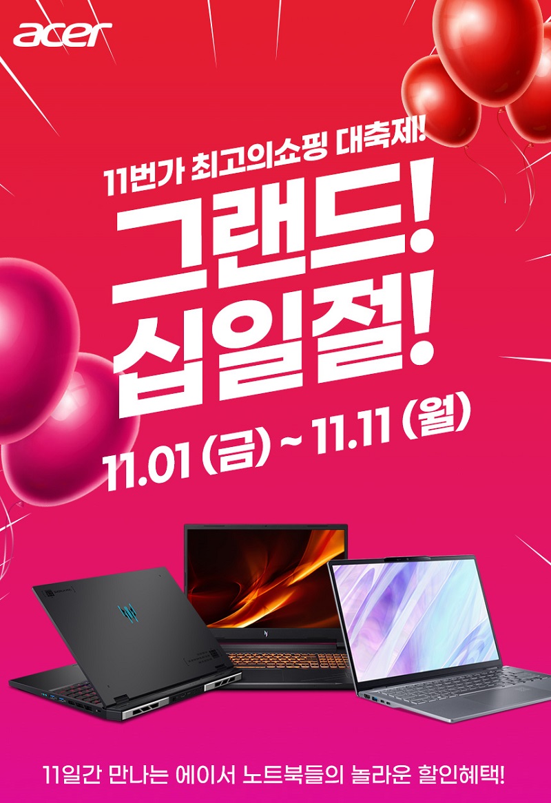 글로벌 PC제조사 에이서(Acer)가 11번가 연중 최대 할인 행사인 ‘그랜드 십일절’에 참여해 자사의 인기 노트북 15종을 최대 30% 할인된 가격에 판매한다고 밝혔다.