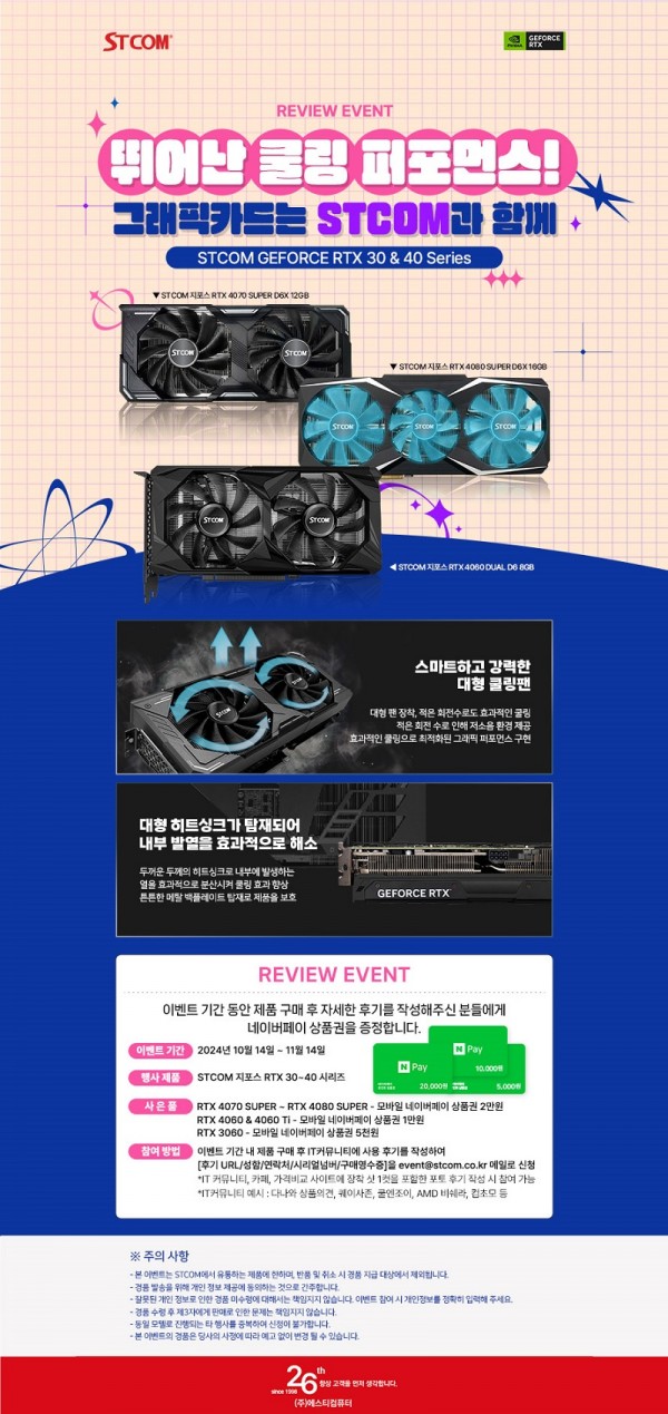 1998년 설립되어 전문적으로 컴퓨팅 관련 제품군을 국내에 공급해온 (주)에스티컴퓨터(이하, STCOM)는 유통사인 (주)에스티컴퓨터(대표 서희문, 이하 STCOM)는 STCOM 지포스 RTX 30 & 40 시리즈 그래픽카드 구매자를 대상으로 10월 구매 후기 작성 행사를 진행한다.