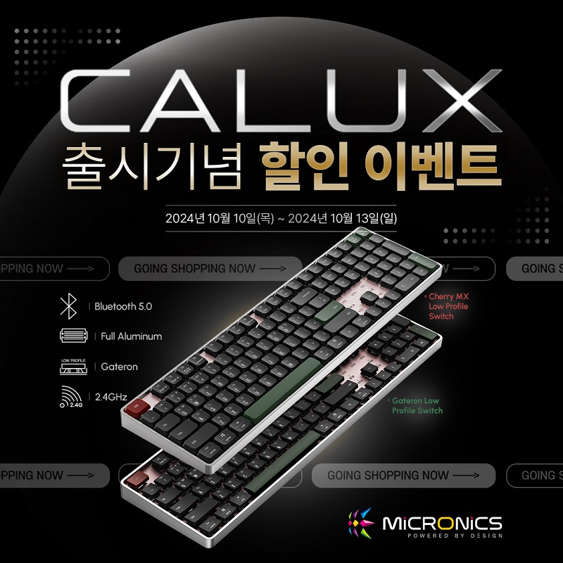 게이밍 기기 전문기업 한미마이크로닉스(대표: 강현민, 이하 마이크로닉스)는 프리미엄 키보드 '칼럭스(Calux)' 키보드 출시를 기념해 한미마이크로닉스 공식 스마트스토어에서 10% 할인 행사를 진행한다.