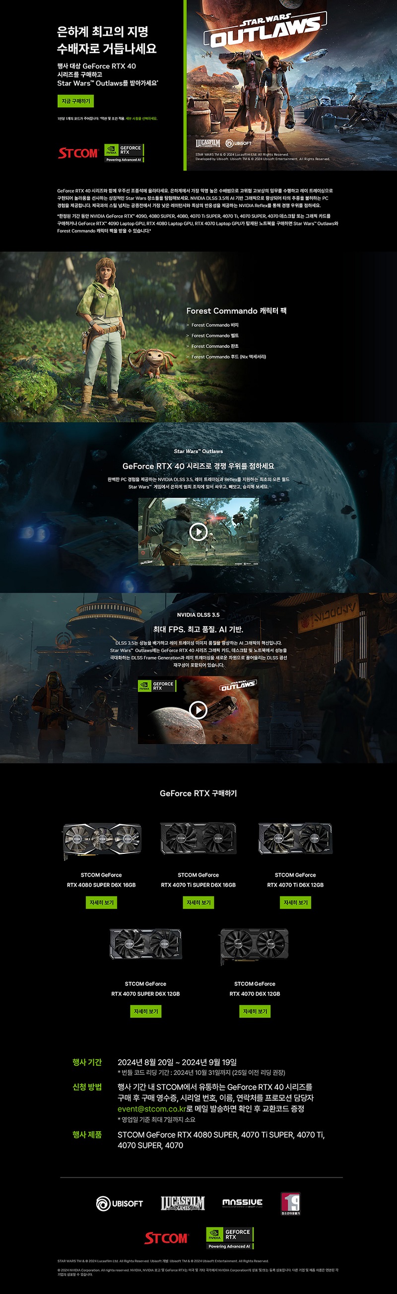 스타워즈: Outlaws 번들 증정 이벤트는 2024년 8월 20일부터 2024년 9월 19일 내에 STCOM 지포스 RTX 4070 시리즈 이상 그래픽카드를 구매할 경우 참여가 가능하며 증정 받은 번들 코드는 2024년 10월 31일까지 등록할 수 있다. 이벤트에 참가하는 방법은 행사 대상 제품을 구매 후 event@stcom.co.kr로 구매 영수증, 시리얼 번호, 성함 및 연락처를 첨부하여 접수 시 신청이 가능하다.
