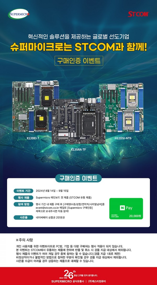 컴퓨팅 제품군 전문 유통사인 (주)에스티컴퓨터(대표 서희문, 이하 STCOM)는 슈퍼마이크로 서버, 워크스테이션용 메인보드 구매자를 대상으로 구매 인증 이벤트를 진행한다.