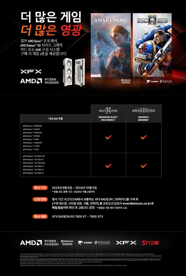행사 번들에는 출시 예정인 고사양 신규 게임 2종이 포함되어 있다. 3인칭 FPS 슈팅 게임인 워해머 40000: 스페이스 마린 2와 3인칭 액션 어드벤처 게임인 언노운 9: 어웨이크닝이 포함되어 라데온 RX 7600 XT 이상 구매자들은 두 가지 게임을 모두 즐길 수 있다. 행사는 2024년 8월 6일 부터 10월 5일까지 진행되며 기간 내에 행사 대상 제품을 구매 후 event@stcom.co.kr로 인증 시 번들 코드를 수령할 수 있다.