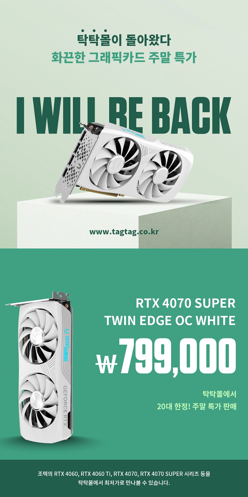 조텍, 조텍코리아, ZOTAC, ZOTAC Korea, 탁탁몰, tagtag, 인기, 화이트, RTX 4070 SUPER, 그래픽카드, 주말, 깜짝 특가, 진행