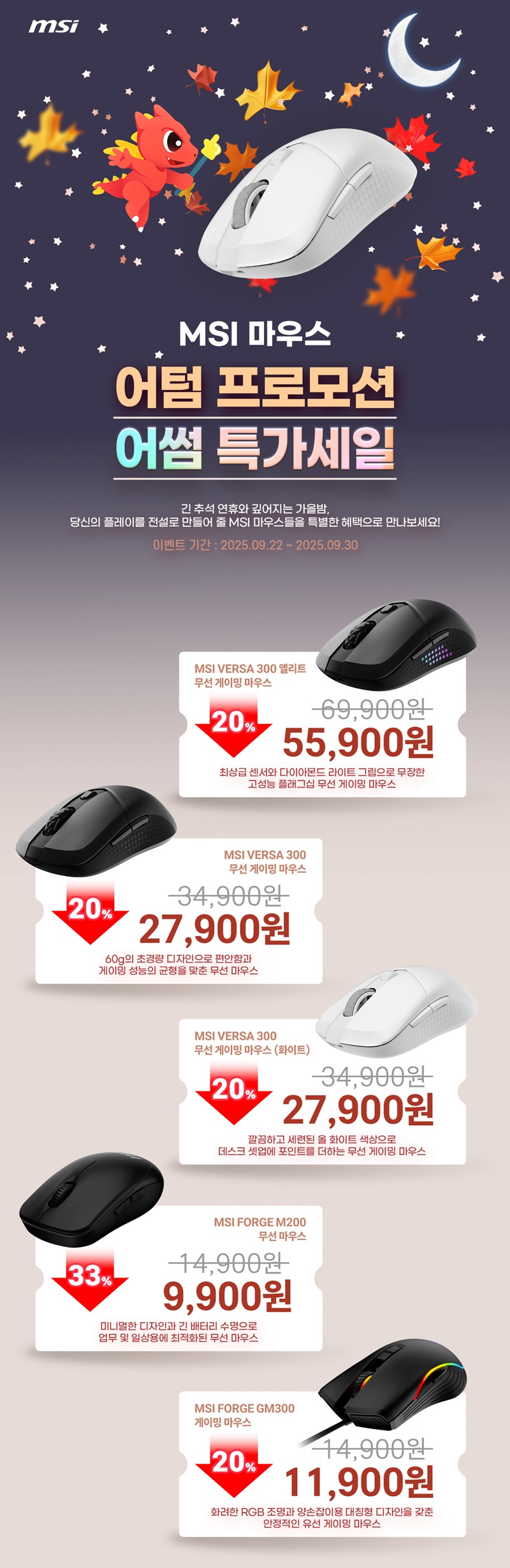 행사 대상 주요 모델은 초경량 디자인과 정밀한 센서로 최고의 게이밍 퍼포먼스를 제공하는 ‘MSI VERSA 300 엘리트 무선 게이밍 마우스’와 인체공학적 설계로 장시간 사용에도 편안한 그립감을 선사하는 ‘MSI VERSA 300 무선 게이밍 마우스(블랙/화이트)’, 그리고 사무용에 특화된 ‘MSI FORGE M200 무선 마우스’와 유선 제품인 ‘MSI FORGE GM300 게이밍 마우스’ 등 총 5종이다.