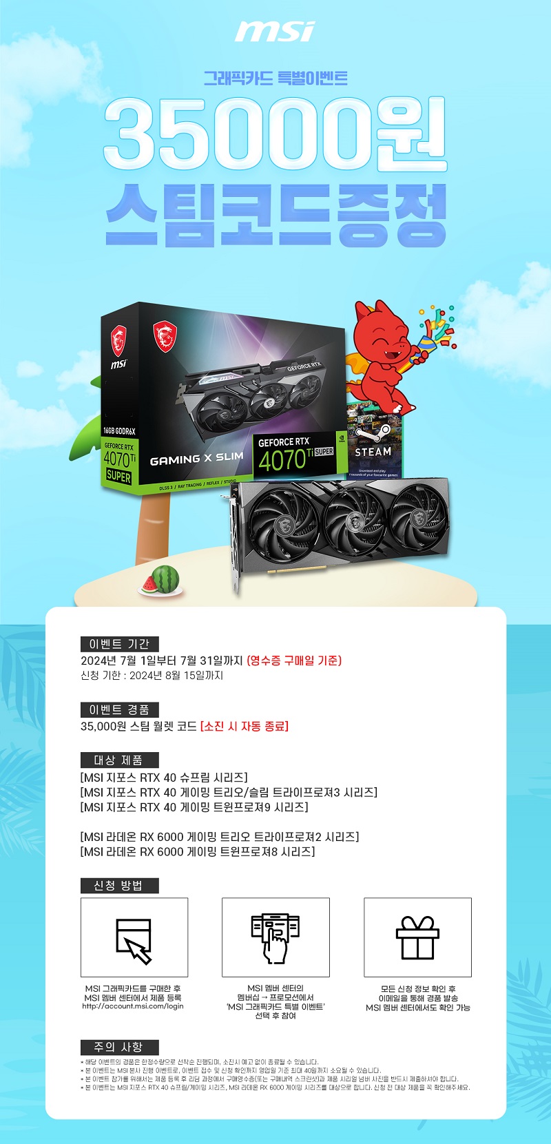 (주)엠에스아이코리아, 엠에스아이, MSI, MSI Korea, 그래픽카드, 구매 고객, 스팀 월렛, 35000원, 코드, 증정, 행사, 진행