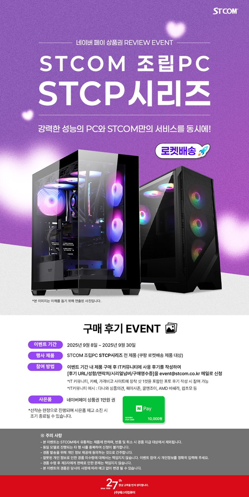 1998년 설립되어 20년 이상 컴퓨팅 관련 솔루션을 유통해온 전문 유통사인 (주)에스티컴퓨터 (대표: 서희문, 이하 STCOM)는 쿠팡 전용 완본체 “STCP” 시리즈 대해 구매 후기 행사를 진행한다.