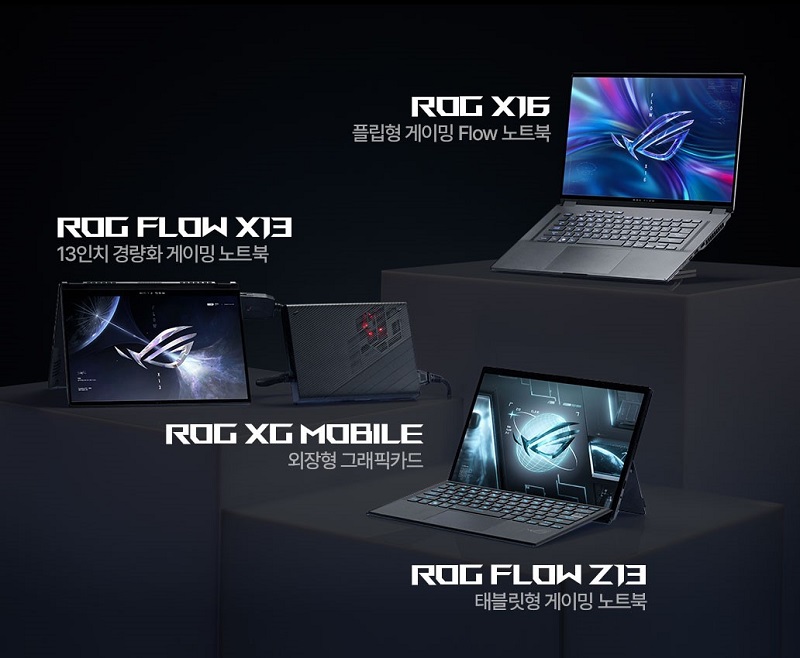 ASUS ROG Flow X13(13인치)과 X16(16인치)은 최대 엔비디아 지포스 RTX 3060와 라이젠 R7-6800HS이 탑재되었으며 가벼운 무게와 슬림한 바디로 편리한 휴대성을 자랑한다.
