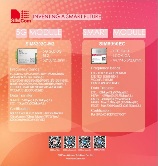 SIMCOM은 급성장하는 5G 모듈 수요를 충족시키기 위해 5G 제품 연구개발에 대규모 투자를 단행하고 있다. SIMCOM의 5G 모듈은 2018년 처음 출시됐으며, 현재 R15 또는 R16 프로토콜을 지원하는 약 20개의 5G 모듈이 판매되고 있다. 5G NSA와 SA를 지원할 뿐만 아니라 6GHz 이하의 주파수 대역과 밀리미터파를 커버하고 있어 의료와 헬스케어, 스마트 페이먼트, PoC, 에너지, 스마트 엔지니어링, 차량, 운송 등 업계의 성능, 포장, 비용 및 기타 다양한 요구를 충족할 수 있다.