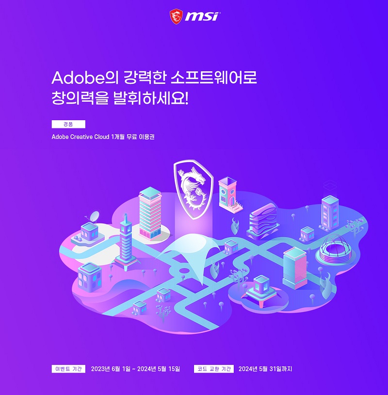 (주)엠에스아이코리아, 엠에스아이, MSI, MSI Korea, 노트북, 그래픽카드, 메인보드, 모니터, 데스크탑, 게이밍 기어, 제품 등록, 제품 구매, 어도비, Adobe, 크리에이티브 클라우드, Creative Cloud, 이용권, 증정, 행사, 진행