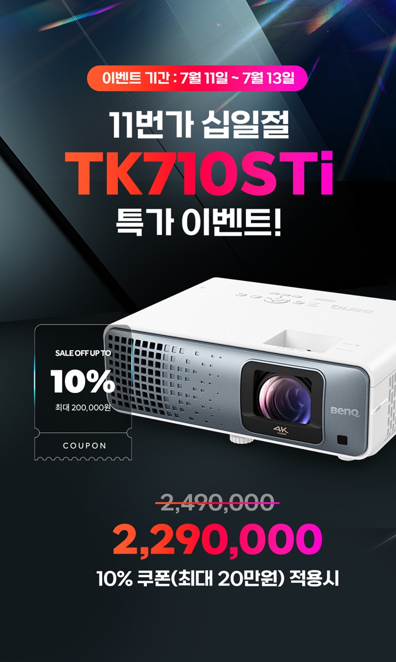 이번 행사 대상 제품은 ▲TK710STi ▲TK710 ▲GV50 ▲MH560 ▲MW560으로, 행사 기간 동안 11번가에서 제공하는 10% 할인 쿠폰을 적용해 합리적인 가격에 구매할 수 있다. 특히 일부 모델은 최대 20만 원까지 할인 혜택이 적용된다.