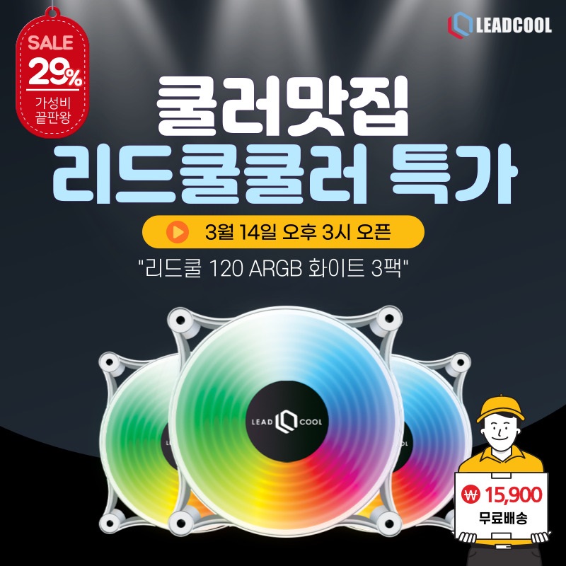 컴퓨터 관련 부품및 쿨링 전문 브랜드인 리드쿨(LEADCOOL)은 오는 3월 14일(월) 오후 3시부터 다나와 DPG 특가몰에서 '120 ARGB 화이트(3PACK)' 시스템 쿨러 제품을 한정 수량 특가로 진행한다고 밝혔다.