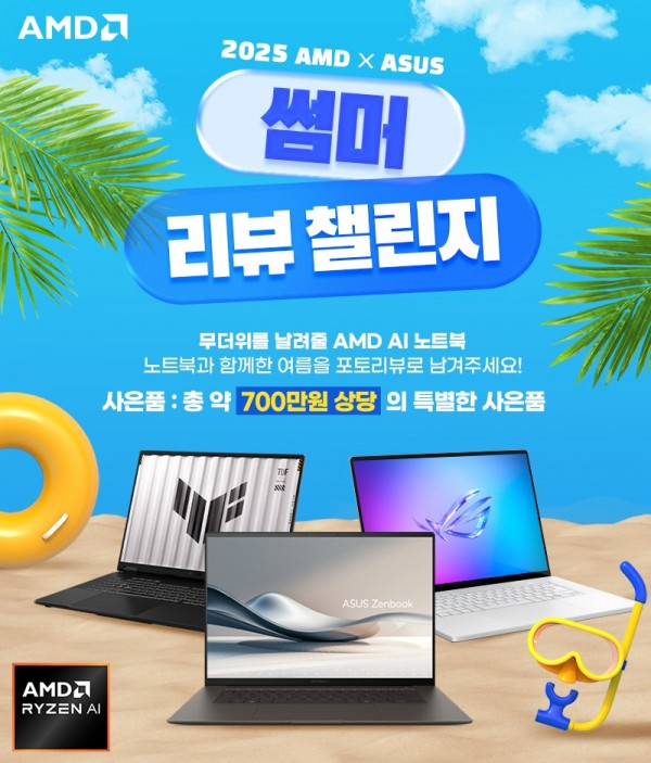ASUS 공식 유통사 (주)에스라이즈가 오는 8월 31일까지 AMD와 ASUS가 여름을 맞아 특별한 사은품을 증정하는 ‘2025 썸머 리뷰 챌린지’를 진행한다고 밝혔다. 이번 이벤트는 AMD 프로세서가 탑재된 ASUS 노트북 구매 후 포토 리뷰를 작성한 고객을 대상으로 하며, 총 700만 원 상당의 푸짐한 사은품이 준비되어 있다.
