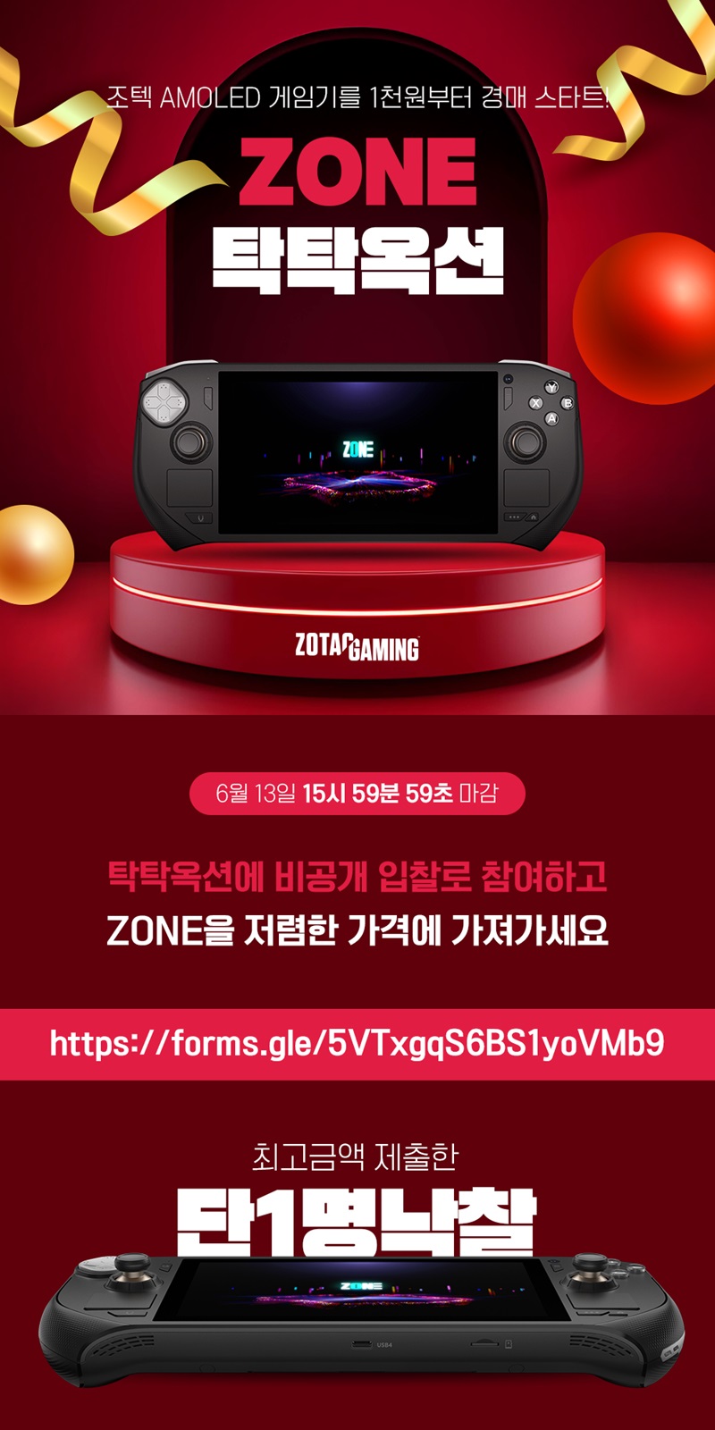 저렴한 가격에 제품을 만나볼 수 있는 ‘탁탁 옥션’은 조텍코리아 공식 쇼핑몰 ‘탁탁몰(www.tagtag.com)’에서 판매하고 있는 조텍의 핸드헬드 PC인 ‘ZOTAC GAMING ZONE’ 대상으로 진행된다. 본 이벤트에서는 899,000원에 판매되고 있는 ‘ZOTAC GAMING ZONE’을 시작가 1,000원부터 1,000원 단위로 구매 제출을 할 수 있다. 중복 참여가 가능하며 비공개 입찰 방식으로 진행된다. 옥션이 마감되는 6월 13일 15시 59분 59초까지 제출된 최고 금액 당첨자에게 구매의 기회가 제공된다. 구매를 위해서는 탁탁몰 가입은 필수이다.