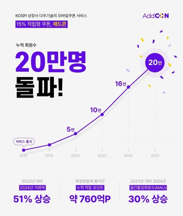 다우기술(대표이사 김윤덕)이 운영하는 모바일쿠폰 서비스 ‘애드콘’이 누적 회원수 20만 명을 돌파했다고 10일 밝혔다.