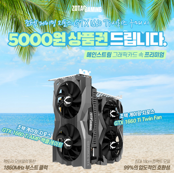 조텍코리아(ZOTAC Korea, 대표이사 김성표, www.zotackor.com)가 인기 게이밍 GTX 그래픽카드인 ‘조텍 게이밍 지포스 GTX 1660 Ti 시리즈’ 대상으로 상품권 증정 프로모션을 진행한다.