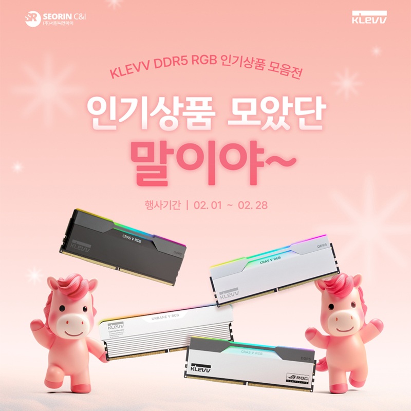 컴퓨터 관련 주요 부품 수입 유통 전문 업체 서린씨앤아이(대표: 전덕규 www.seorincni.co.kr)가 클레브(KLEVV) DDR5 RGB 인기상품 모음전 인기상품 모았다 말이야~를 진행한다. 이번 기획전은 오는 2월 28일까지 운영한다.