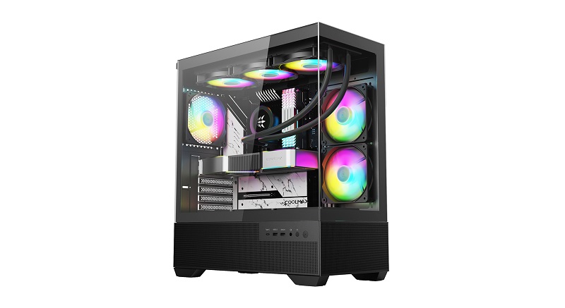쿨맥스 멜로디 XL 뷰는 풀 파노라믹 디스플레이를 적용한 미들타워 케이스로, ATX·M-ATX·Mini-ITX 메인보드를 지원하며 최대 9개의 쿨링팬, 360mm 수랭 라디에이터, 165mm 공랭 쿨러, 410mm 그래픽카드 등 폭넓은 호환성을 제공한다.