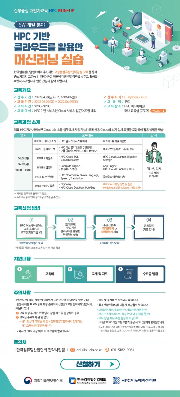 한국컴퓨팅산업협회가 6월 6일까지 HPC 기반 클라우드를 활용한 머신러닝 실습 프로젝트 참가자를 모집한다고 밝혔다.